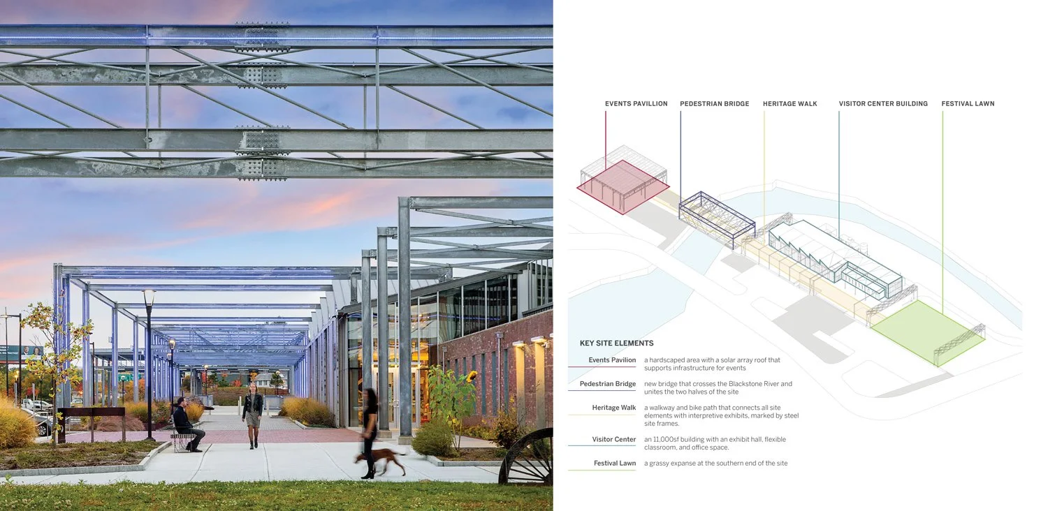 While the loss of the iconic mill structure was considered a huge setback for the project, there was a silver lining. With the need to build an entirely new building, design focus shifted to optimizing the relationship between building and landscape programs to achieve a more integrated overall visitor experience. The landscape became a progenitor of a larger and more diverse set of public programs extending the mission of the Visitor Center to accommodate larger community events and special happenings. Consequently, the design approach sought to expand cultural programming opportunities across the site in such a way as to frame the Blackstone River Canal as the center piece to the entire facility. A pedestrian bridge was created roughly at the point where the historic river crossing used to be and provides unique engagement of the dynamic qualities of the river itself and the associated ecology. The large performance lawn serves also to safely cap what is contaminated soils below, allowing for safe Public re-use of the site.