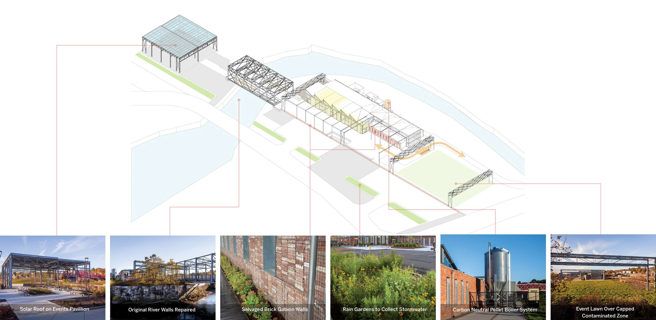 The ultimate proposal creatively weaves together site infrastructures, urban systems, ecological conditions, progressive storm water management strategies and historical artifacts into a cohesive, full-site experience – contemporary in nature, but visually consistent and respectful of the industrial past. It was the goal of the entire design group to achieve a truly public and accessible amenity for area residents and visitors alike.