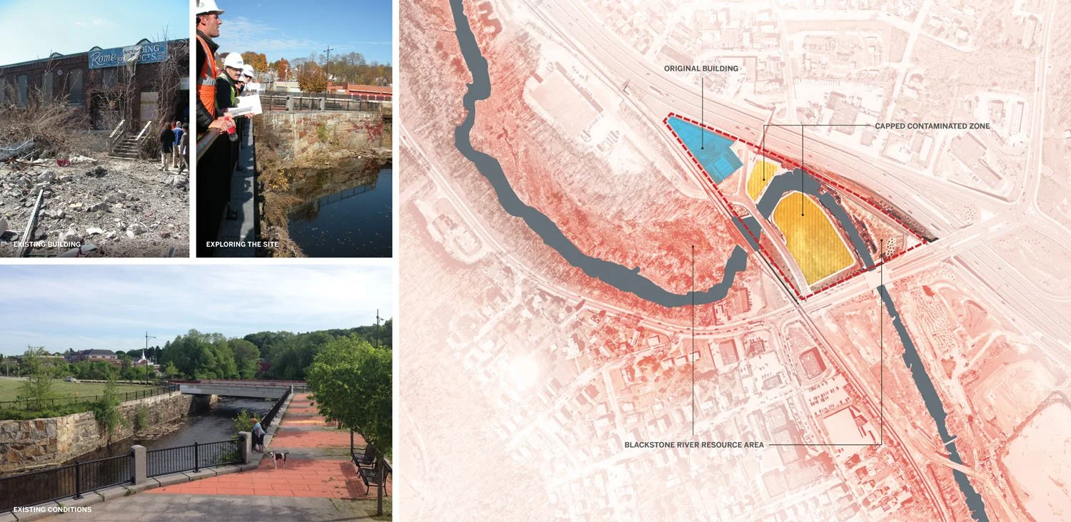 The story of the Visitor Center begins in 2004, in part, as a dream of the Director of the Worcester Historical Museum. Initially conceived of as an adaptive reuse project of the Washburn and Moen Mill Building in Worcester’s Quinsigamond Village, the Visitor Center sought to celebrate the rich cultural, industrial and ecological character of Worcester and the greater Blackstone River Valley area. The collective vision for the Center and associated grounds was to provide for the Visitor authentic and unique experiences of and with existing remnant architectures, the Historic and protected Blackstone River Canal, and the regional plant communities moving across and through the site. However, in 2010, the Washburn and Moen Mill Building burned to the ground, necessitating a completely new approach to the Visitor Center and site.